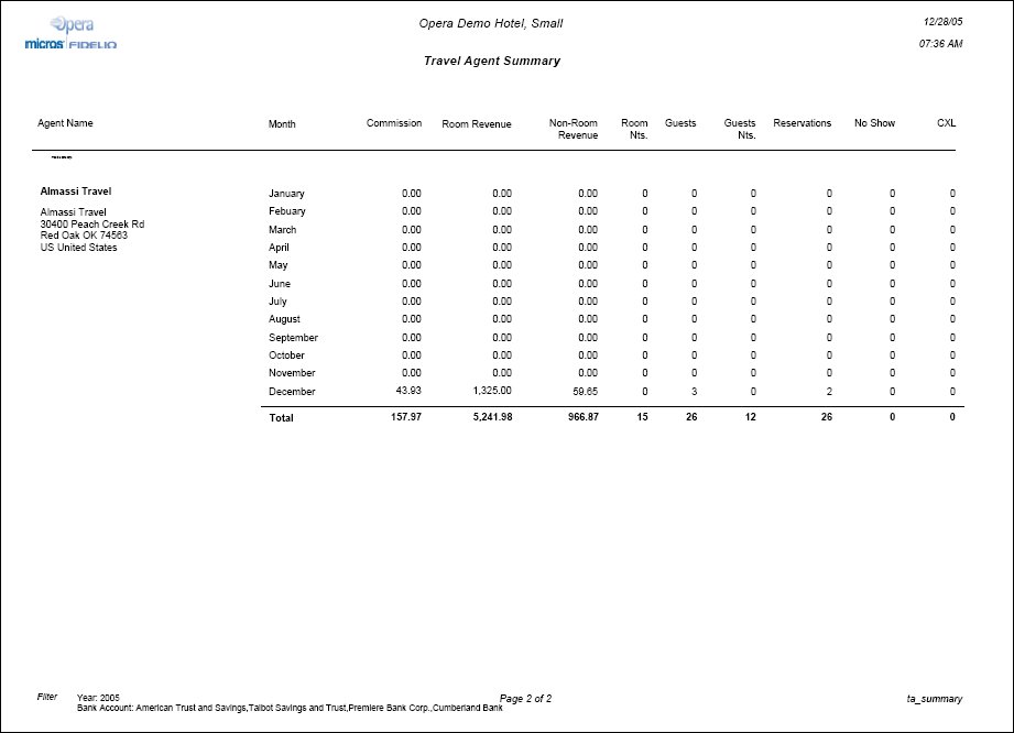 The Travel Agent Summary is a month-by-month digest of Commissions, Room Revenue, Non Room Revenue, Room Nights, number of Guests, Guest Nights, and No Show and Cancelled reservations for each Travel Agent. The data includes all reservations that have been placed in Commission Processing because a Travel Agent or Source Profile was attached to the Reservation. The filter criteria allows a search by the Bank Accounts from which the commission was paid and the year when the commission was earned.
