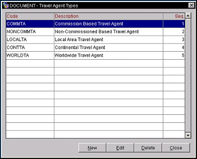 To create a new Travel Agent Type select the New button. To edit an existing Travel Agent Type, highlight your choice and select the Edit button. The New or Edit Travel Agent Type screen appears. Provide the following information: