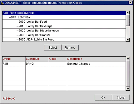 For example, in the top grid, highlight a routing code (e.g., F&B, which might include all restaurant and bar charges), and/or a specific transaction code (e.g., transaction code 5000 - Greens Fees). Then select the Select button to move the highlighted transactions to the lower grid, which shows the transactions that you have chosen.